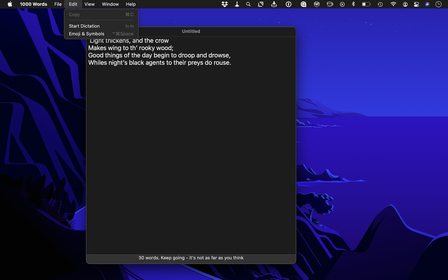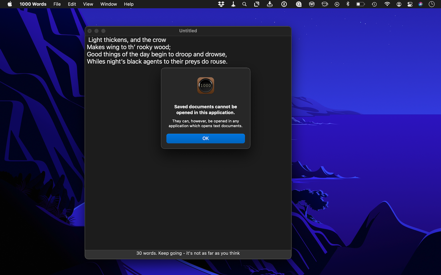 Once you hit 1000 words you can save the document as a text file then open it in any other app which opens text documents and edit to your heart’s content. At least you will have achieved that 1000 word goal.