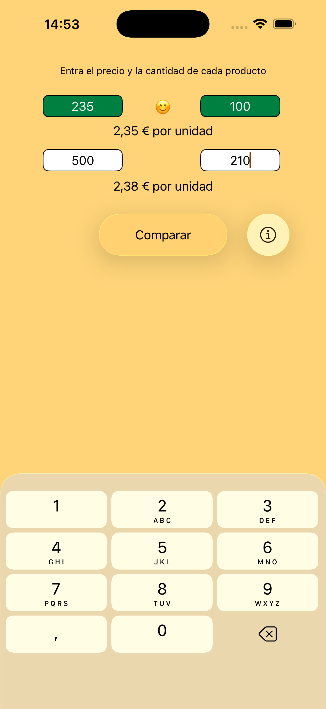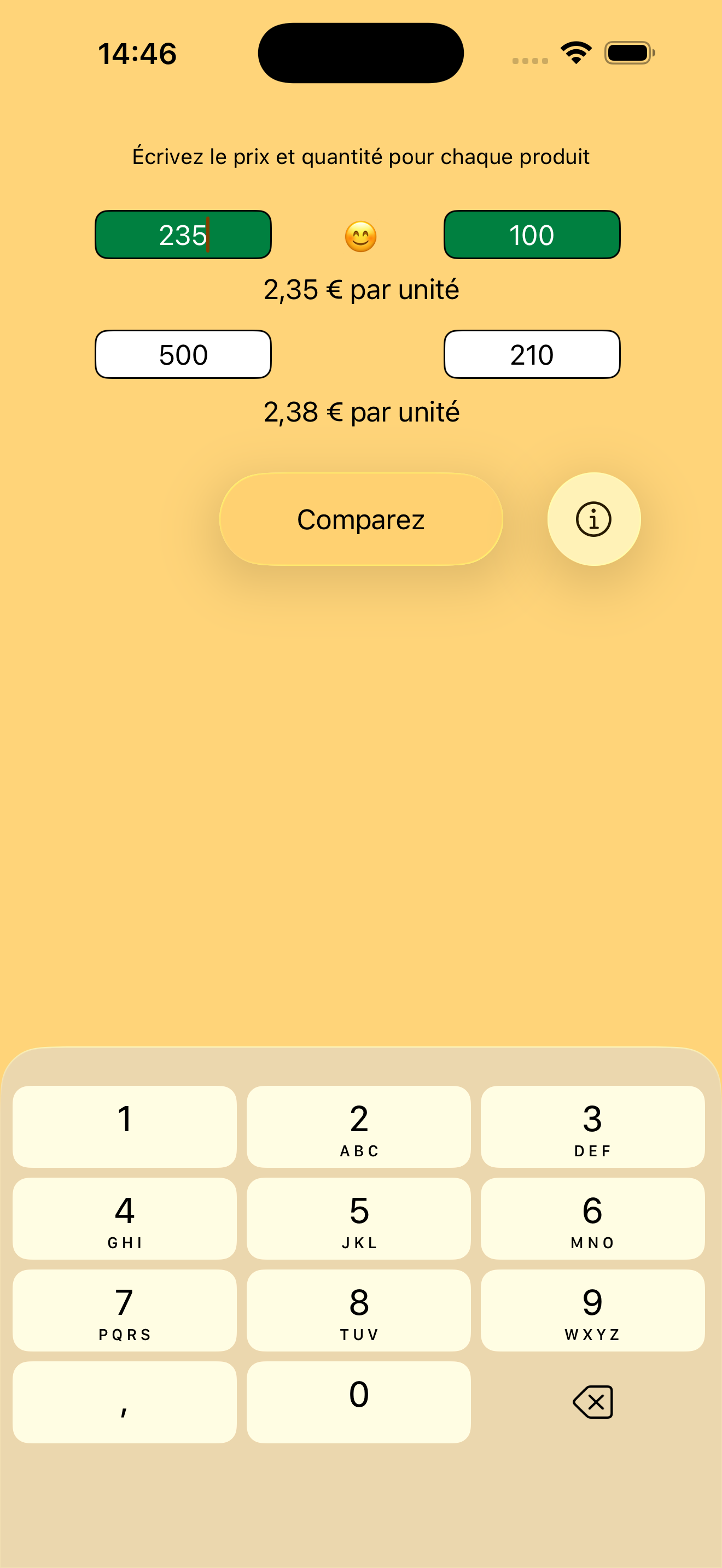 You're in the shop. Do I buy three of these for this price, or two of those for that price? Which one's the bargain? You can find out easily with Bargain. Just reach in your pocket, launch the app, enter the price and quantity for each item then tap Compare. Done!